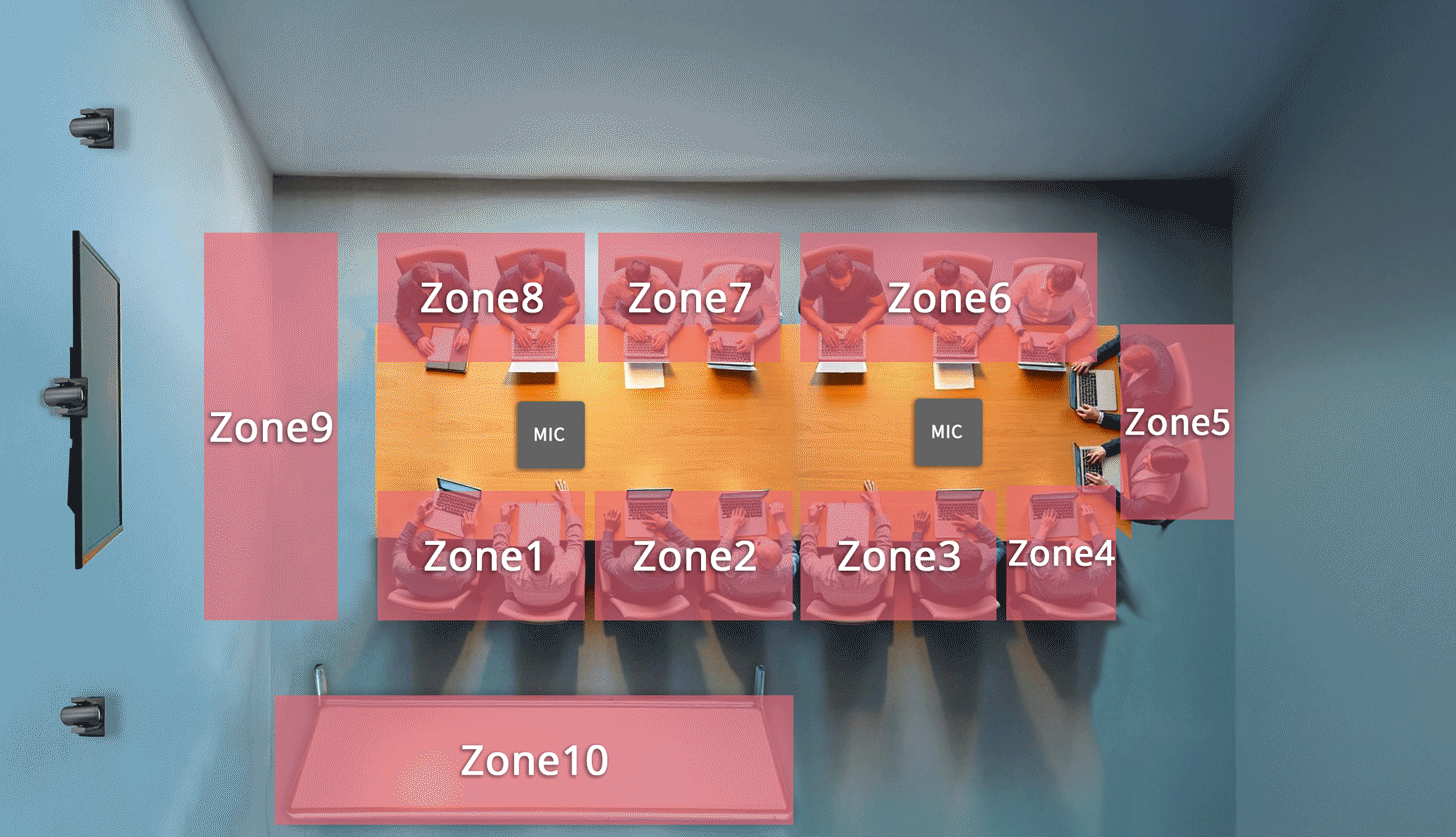 Zone Mode is especially useful in spaces where people sit close together or in multiple rows. When the microphone reports the speaker’s location (X/Y position), CamConnect immediately triggers a camera to capture that zone, with no user input required.