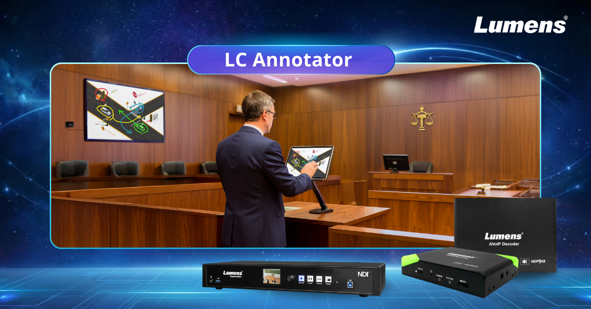 Lumens CaptureVision processeurs multimédias offrent un enregistrement multicanal et une interface intuitive pour capturer l’intégralité de la séance d’audience — du témoignage des témoins à la présentation des preuves et aux interactions entre les parties. Nouvelle dans la gamme, la LC100A, avec sa fonction d’annotaneur. Ainsi, les utilisateurs peuvent enregistrer et diffuser simultanément la vue caméra et une source vidéo informatique ou secondaire, avec le texte à l’écran et les annotations réalisées dans l’interface LC instantanément reflétés sur la sortie.