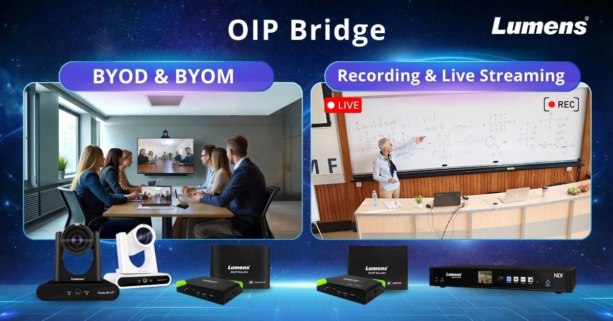 Le pont OIP sert de centre de signal flexible pour les caméras IP, Dante AV-H, NDI et certifiées Microsoft Teams, permettant la commutation en temps réel de la source et la production de qualité professionnelle — sans besoin d’un support continu de l’équipe AV. Incluez un Lumens CaptureVision au réseau pour l’enregistrement instantané et le streaming, ainsi que l’option de branding visuel.