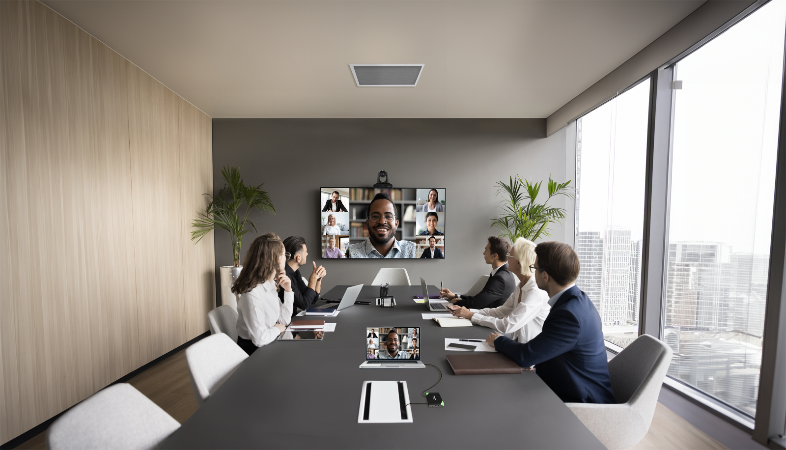 IP cameras, Dante microphones, and Dante speakers are seamlessly integrated into a single IP architecture. With one USB-C connection, users can instantly access all room devices from their laptop.