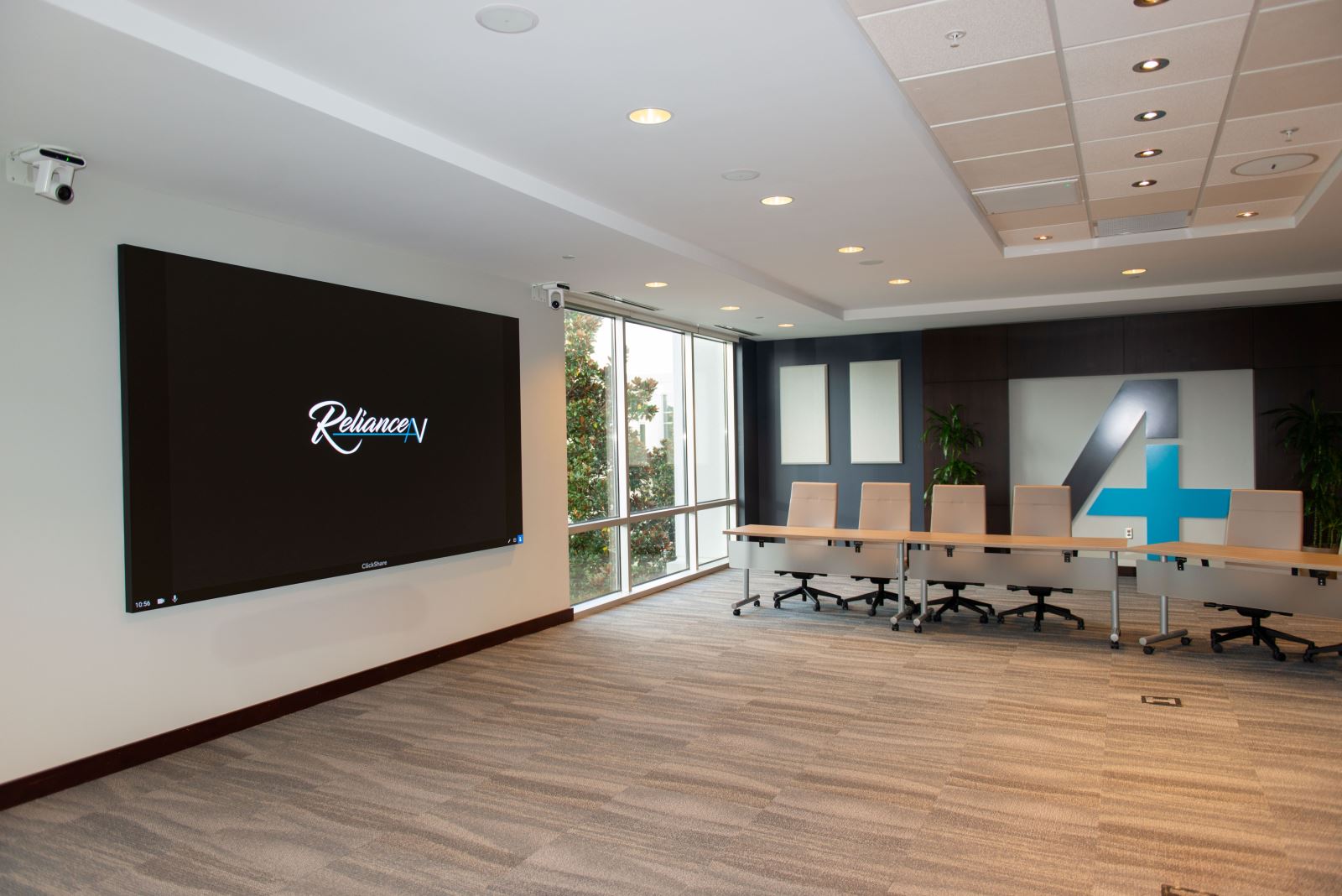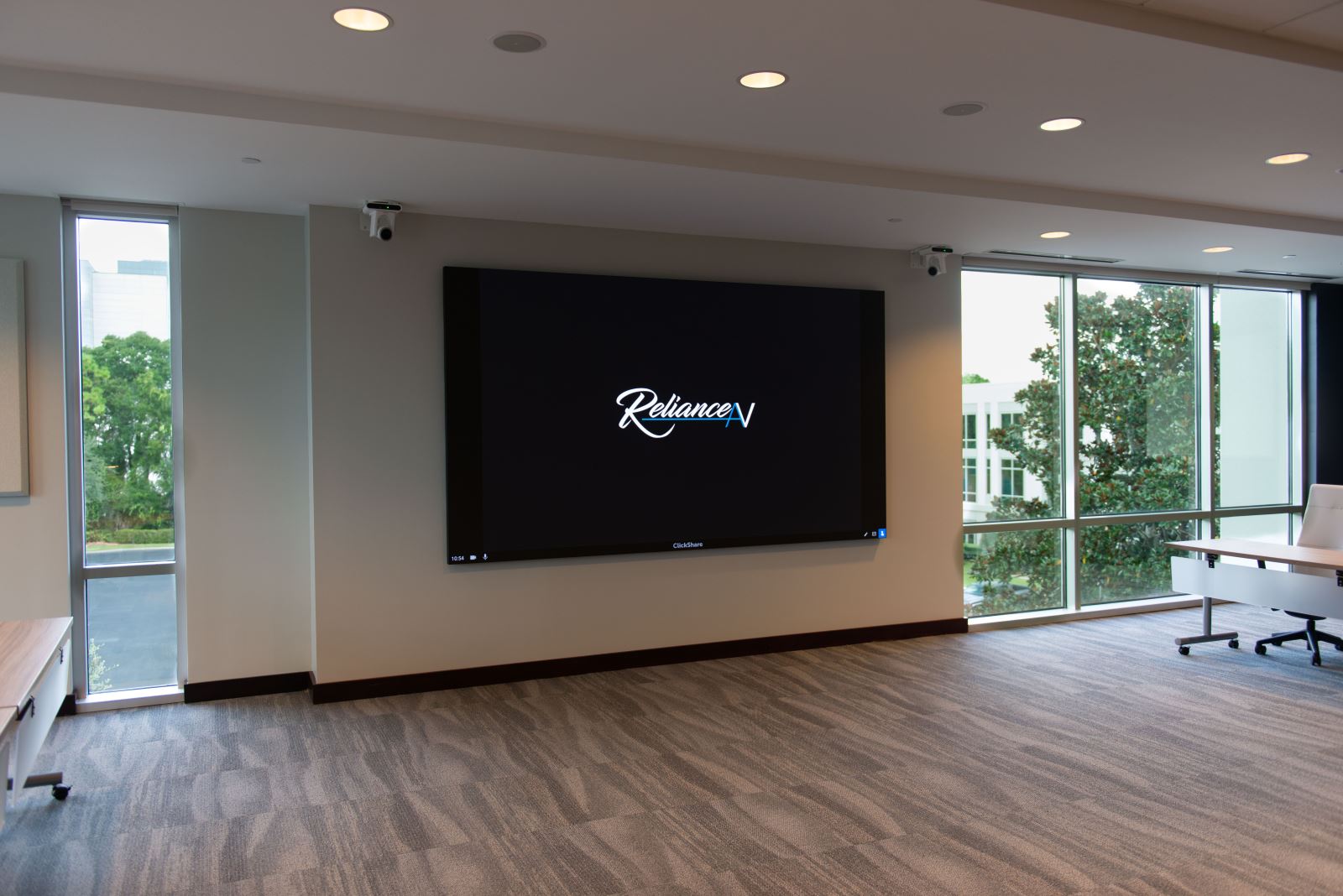 會議室還整合了 Barco ClickShare,可無線分享內容,讓團隊成員能從任何裝置即時呈現。這些解決方案共同打造順暢且專業的會議體驗,並由 JBL 天花板喇叭、聲學處理及令人驚豔的 135 吋 LED 視訊牆進一步提升。結果是一個現代化、自動化的會議空間,支持清晰的溝通、混合協作及輕鬆的日常運作。此解決方案與 RelianceAV 合作實施,RelianceAV 的整合專業確保所有技術——從音訊到攝影機追蹤——都能無縫協同運作。